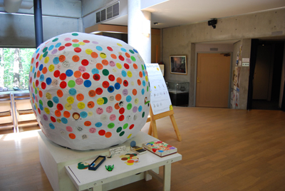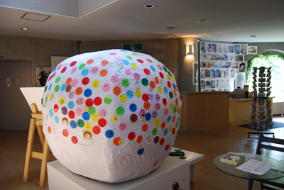 ロビー中央に設置したことでぐるりと一周、どこにでも小さな円を貼れるようにしていたのですがどうしてもある部分に集中してしまうようだったので、期間中に何度か回転させてみたりもして(笑)…でもその回転が斜めになっていたらしく貼付けも斜めに進んでいっているのに気がついて皆であたふたあたふたしたり…(笑。