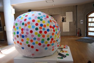 安曇野各所をまわっている『安曇野スタイル「おひさま」応援部』のプチワークショップ。当館への設置期間も明日までとなっています。真っ白で届いたおおきな『おひさま』も、いつの間にかこんなにカラフルになってます。