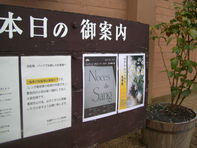 展示替えをしましたので、敷地入口の門の脇にある『ご案内板』の掲示も新しくなりました。(閉館後の撮影となってしまったために門は閉まってますね…(スミマセン! > <)この更新も毎度それ用のデータを用意したりちょっと大変だったりしてますが、こちらをご覧になってお入りくださっているお客様もおられるようなので頑張ってます。そして日焼け等にも注意しながら(何せ南向き!!(笑。)場合によっては交換なぞもしております。