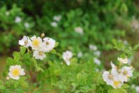 ここ数日、なんだか暑い日が続いてますね。安曇野も8月上旬並みの気温だそうですが、館内は涼しい!(ホッ-)です。今年はなかなか天候が安定せず森の芽吹きも彩りも時間が例年よりもかかっていたのですが、先週あたりからはマーガレットも順次ようやく楽しめるようになっていて、この数日ではついにカフェの南壁面を覆っているつるバラが咲き始めています。そして森の各所に自生するひとえの野バラたちも、いつの間にか小さな白い花を静かに咲かせてくれていました。『これが咲くと雨が降る』と植物ずかんを描いたスタッフが言ってましたが、確かに予報では明日あたりから雨だとか?!…スゴイ。