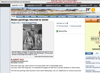 《…1978年、マサチューセッツ州の美術蒐集家バクウィン夫妻のもとからセザンヌ、スーチン(スーティン)、ユトリロ、ジャンセンの7枚の絵画が盗難にあった。これは私邸からの美術盗難事件としては最大規模と言われている事件だった。後に犯人(デビッド・コルヴィン)が割り出されるも彼は1979年に(別事件で)撃たれて死亡しており、当時彼から別件で相談を受けていた友人の弁護士(なんと後に画家としてデビューしていた!)ロバートが彼のこうした隠し財産の在処を知り(このまま我が財産にせんと)ずっと隠し通していた。…》と、この辺りが書かれています。