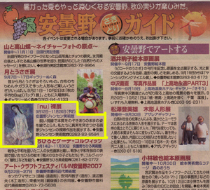 いち早く、市民タイムスさんが無料で発行している「安曇野サテライト通信」に秋季企画の情報を掲載いただきました。(早ッ♪!! …といっても、展示はまだイタリアです。(笑 イタリア展は今日が終われば残り一週間となっています。 そして明日は一ヶ月振りの定休館日(火曜ですヨ?)。 いよいよ来週の展示替えに向け、一同また気力を養っておかねばなのでお許しください。
