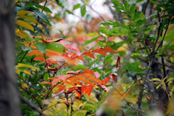今日は何だか一気に冷え込んでいるようで、天には重たい空が広がっています。 森も、中程の一部だけが少しだけ色づいていました。(踏み込めない場所なので望遠で撮影…。(苦笑) 空の灰色、幹の重なった様々な茶色、葉の緑に、日々沢山の絵の具が重ねられていきます。