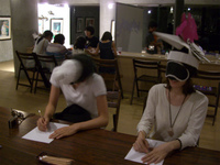 こちらはまず、つけたいマスクを1人1つ選んでもらいました。そして用意していた席につくとなぜかアイマスクを渡され、強制的にまっくらにさせられます。そしてその上から先ほど選んだマスクを付けるわけです。。