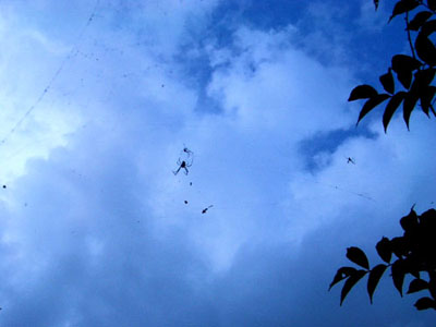 閉館し、帰りに木々の小径で空を見上げたら...織姫が水滴をつけキラキラ光る美しい織物に揺れておりました。
