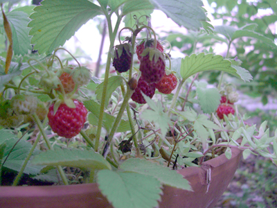 で、下の写真はカフェのテラスで育ついちごちゃんたちその1の鉢。スッパイからか鳥さんにも狙われず、たわわに実ってかわいらしい面差し(笑。