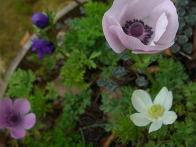 ジャンセンさんの作品で人気の『ひなげしとレモン』にちなんで、毎年ひなげしの種を蒔くのですがなかなか上手に育ちません。で今年はアネモネを植えてみました!そしたらこれが(ちょっぴりですが)ちゃんと咲いてくれて、とってもカワイイです。しかもカラフル?ルルル?♪♪w(笑)