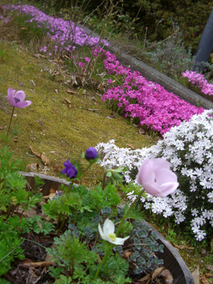ちなみに奥で絨毯のように盛っているのは芝桜とロベリアさん。何年ごしか忘れてしまいましたが毎年キレイに咲き誇ってくれます。森はまだ新芽が小さく茶枯れた感じがしていますが、ここはすっかり春色です。
