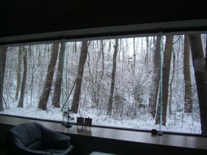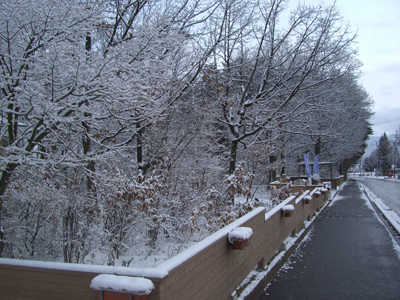 メリークリスマス☆* 今朝の安曇野は雪模様**です。そう!ホワイトクリスマスです☆ミ。とはいえ積雪量としてはせいぜい2~3cm程度なので道路はこの通り、露出していて安心です。敷地内の小径の雪かきだって箒で掃き飛ばすので充分といった具合。(張り切って長靴持参で出勤したのに要らなかった…。)それでも、ロビー窓の景色がとても綺麗?!!。木肌への雪化粧模様で風の向きや勢いなども量れますね。四季折々に楽しませてくれるこの窓辺ですが、冬の雪景色だけは運とタイミング次第です。裏森は人間が踏み入れない聖域となっているので、時には獣の足跡も眺めることが出来ますヨv。