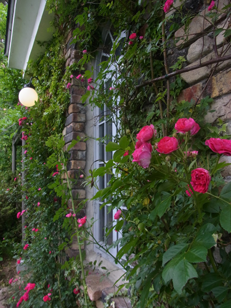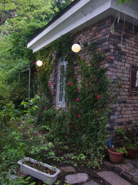 そばカフェ入口の左側。この南壁面には毎年6月半ばにつるバラが一気に咲くので、写真スポットとして立ち寄られる方も多いようなのですが、今年はやはり少し遅いようです。
