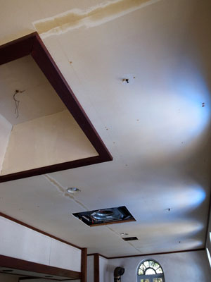 美術館が今日からの3日間で年度の展示替えを行うのに合わせ、そばカフェ(レイヨンヴェール)でも今朝から修繕工事を行っています。これは天井のクロスをはがした時点の写真なんですが…スゴイな〜!照明やエアコンの吹き出し口のカバーなんかも全部外してやってます!(…とか、私も昼休みにコッソリ覗いてみました(笑。)