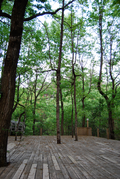 最近、庭が茂ってきたなぁ…とは思ってましたが、木立に囲まれている屋外ステージもいつの間にかこんなにも新緑に包まれています。今年の夏イベント《ジャイロキネシス・レッスン》のことで(実際のステージを見ながら)打ち合わせしていた頃はまだまだ枯れ木で、それから半月も経っていないとは思えません。でもまだまだ茂りますよ〜緑の天蓋のごとく(笑。