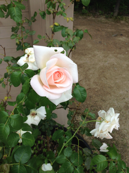 そうです、このコはもう何年も前に豊科近代美術館のバラ祭りで売られていて当館にお嫁にいらした苗木ちゃんです。今ではすっかり大きく育ち、こうして沢山の大輪の花を咲かせてくれています。