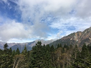 最後にご紹介した写真は、ロープウェイの最後の駅の屋上が展望台になっていたのでそこから撮りました。とんがって見えるのは槍ヶ岳だそうです。反対側からだとこんな感じに見えるんですね。