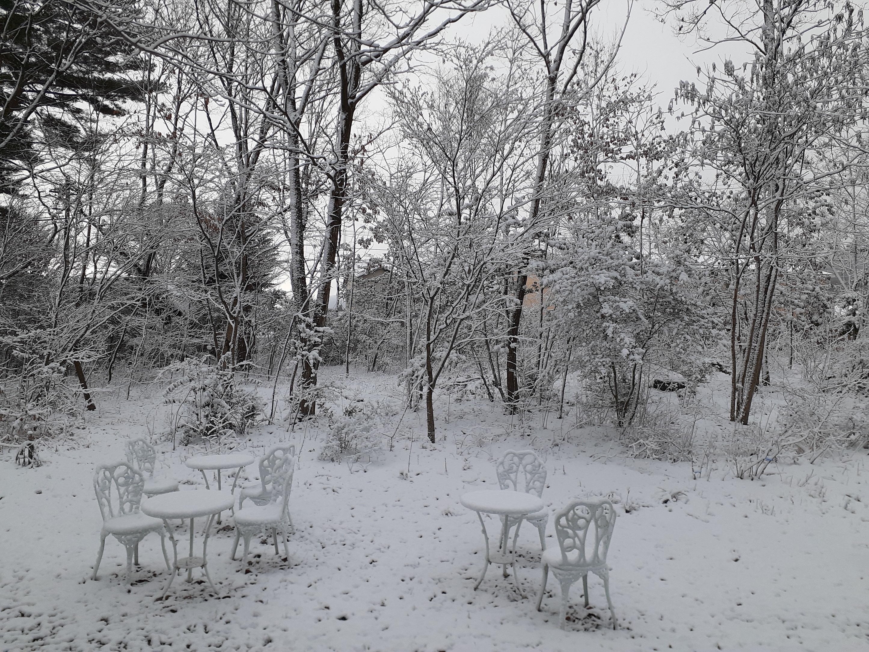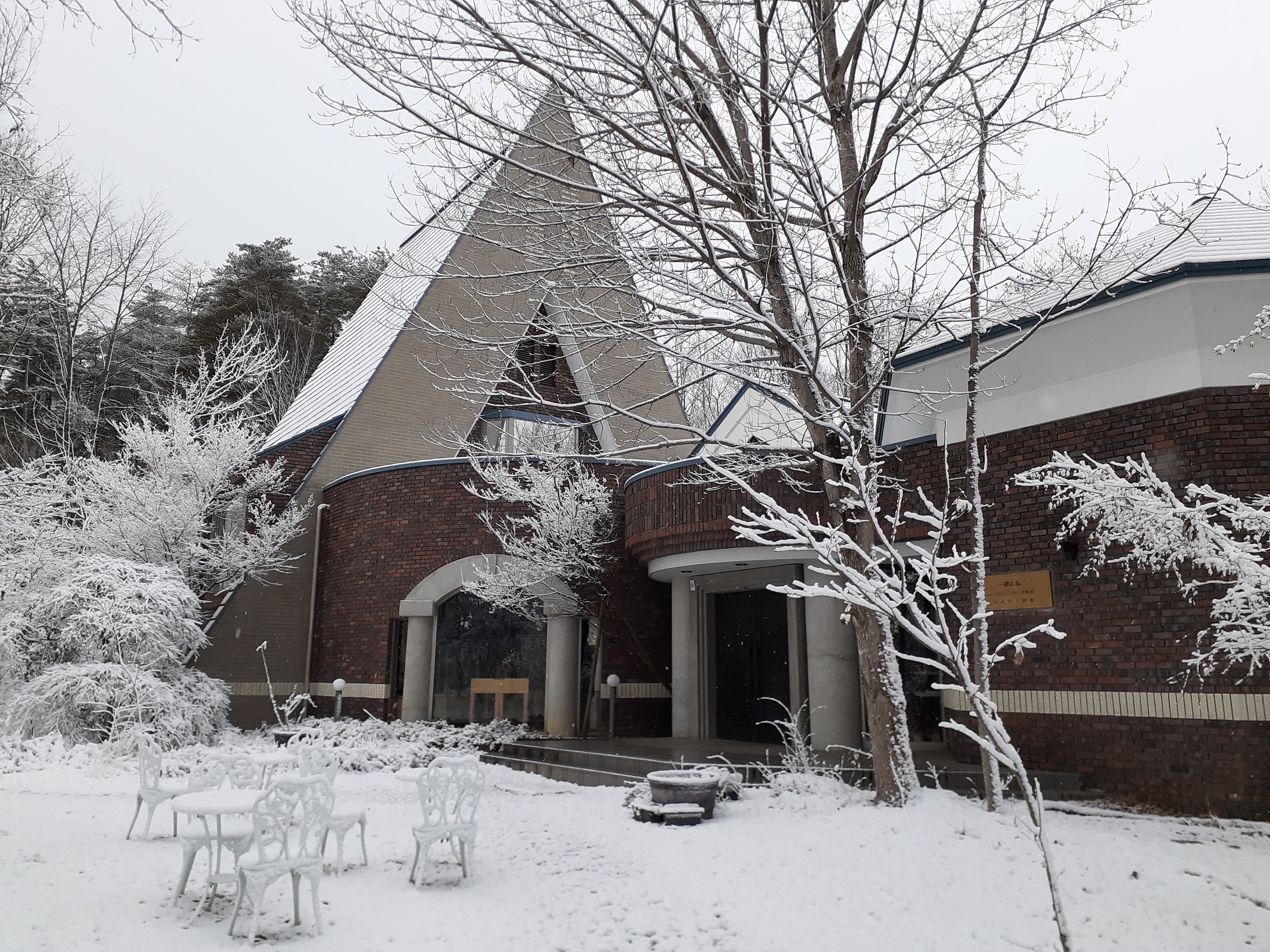 開館前の庭は、木々が雪を纏い幻想的な