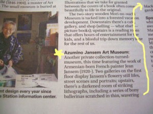いつだったか…飛び込みで取材してくださった松本在住のライターの方が、今朝『遅くなってすみません』と記事掲載新聞を届けてくださいました。安曇野を紹介する記事の中でアートを大きく扱ってくださったようで、大熊美術館さんと駅前のスプーンギャラリーさんを中心にご紹介くださっているご様子です。嬉しいですね!