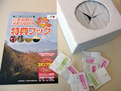 現在、安曇野市観光協会が実施している『いま安曇野がオモシロイ!!』というイベントに当館も参加させていただいています。このイベントの特典ブック(写真参照)は、近隣のSAや駅前の観光情報センター(観光案内所)などで設置配布されている他、各施設でも数十のみKEEPしていて要望のあったときお渡ししていて、参加する安曇野各所の施設にて各施設が指定する期間限定のサービスを受けられるというものです。