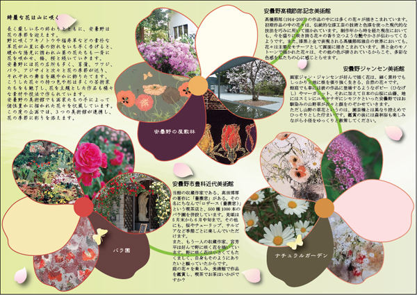 連携企画展示「綺麗な花は山に咲く」をこの春開催する美術館では、開催期間中に限り、パンフレットの花びらを使ったスタンプラリーも実施します。集めてくださった方には3館のささやかな花の絵はがきセットをプレゼントしますのでぜひご参加ください。
