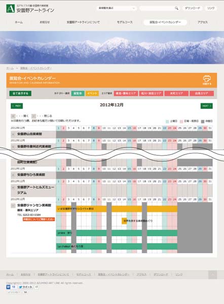 当HPではカレンダーの添付を終了していますが、安曇野アートライン推進協議会では加盟する全施設の展覧会/イベント/休業が一覧出来るカレンダーを設置していますので、こちらを参考にしていただければ営業状況をご確認いただけます。 なお各施設の表示位置は週ごとに移動していきますが、地域(当館ならば穂高豊科エリア)ごとにソートが出来ますし、不要な情報ページは施設名のすぐ左にある「+」や「−」をクリックすることで折り畳んで印刷をすることも可能となっています。 ぜひご活用ください。