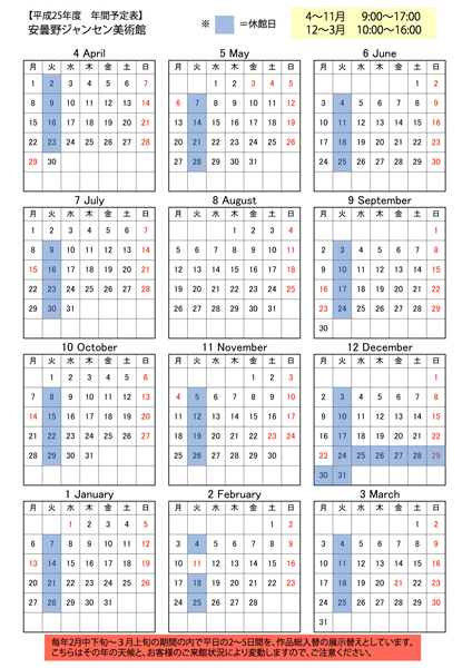 平成25年度の営業カレンダー