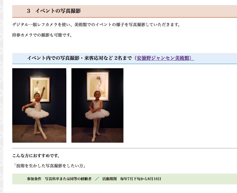 当館も毎年参加させて頂いている『安曇野市美術館博物館連携事業実行委員会』では、2018年度にミュージアムサポーターの募集を行なっています。 各施設が研究や調査のサポートであったり、イベントサポーターであったり、様々な形でサポートしてくださる方を求めています。当館ではプチダンサー等で撮影&対応を手伝ってくださる方を募集することになりました。(写真学科の学生さんも可です。)ご興味がおありの方はぜひリンクページより申込書をダウンロードいただき文化課へお知らせください。 ▶︎詳細ページはこちら