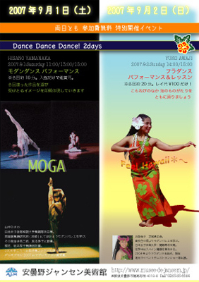 2006年のほうほう堂公演に続くダンスイベントを、今年は2日続きで開催します。昨年はコンテンポラリーダンスでしたが、今年はモダンダンスとフラダンスです。美術館という空間を生かし、作品から得たイマジネーションを表現していくモダン。青空の下木漏れ日のステージで体験レッスンを兼ねた、物語を感じるフラダンス。それぞれの特性を大切にし、また別のいりぐちを開くことが出来たらと考えています。 ※詳細はイベント情報をご覧ください。 開催日:9月1日+9月2日